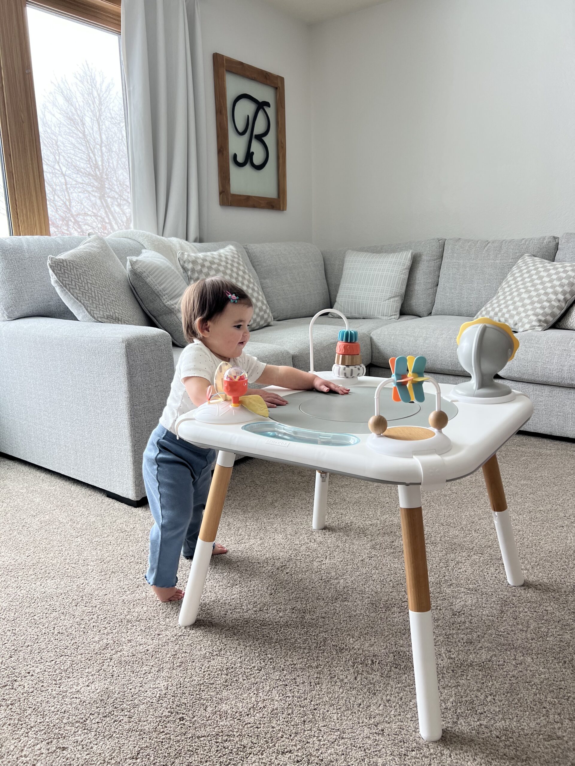 As baby grew older and out of bouncer, we knew she was ready for something more advanced, interactive, and playful. With the Skip Hop Activity Center and Play Table, we were able to place baby in the seat, knowing she’d be entertained and secure. She now stands at the table and walks around to each activity. Moving the table around our home where needed has been a saving grace for keeping her entertained so we can accomplish something. (IYKYK!) It even came outside on our deck with us!