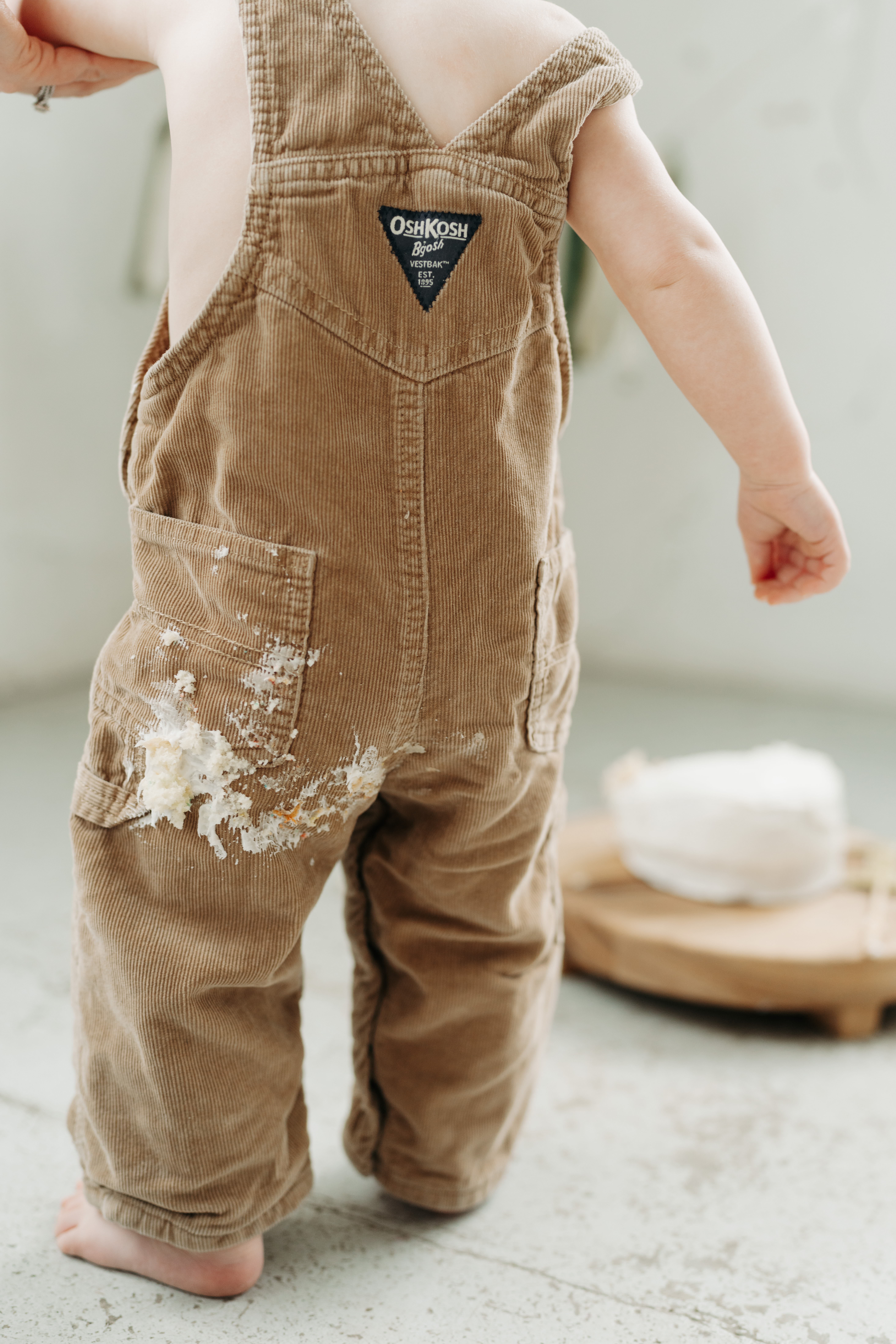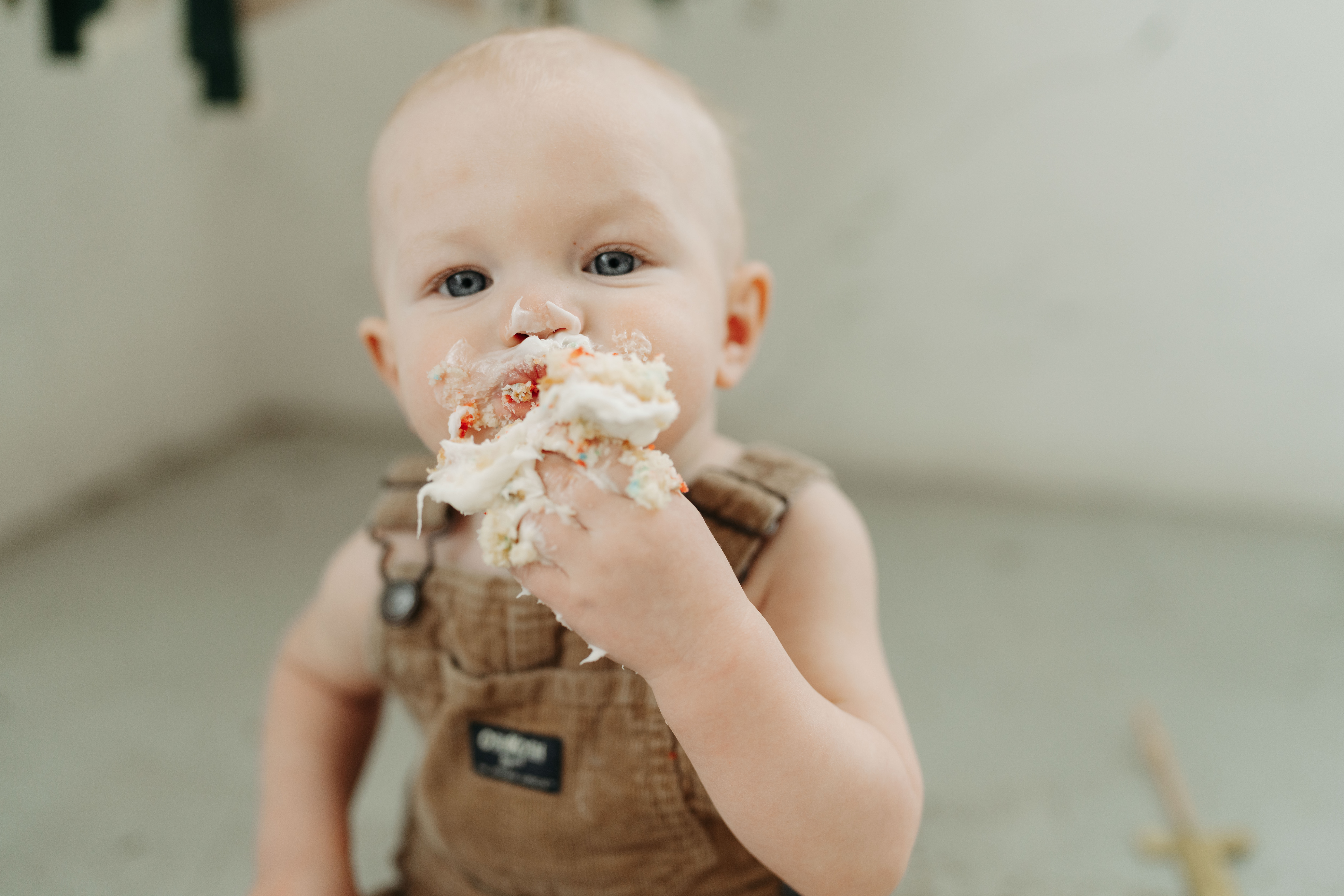 Ending with the cake smash after milestone portraits always works best. It keeps outfits clean for those classic shots. Then we let them go wild at the end.