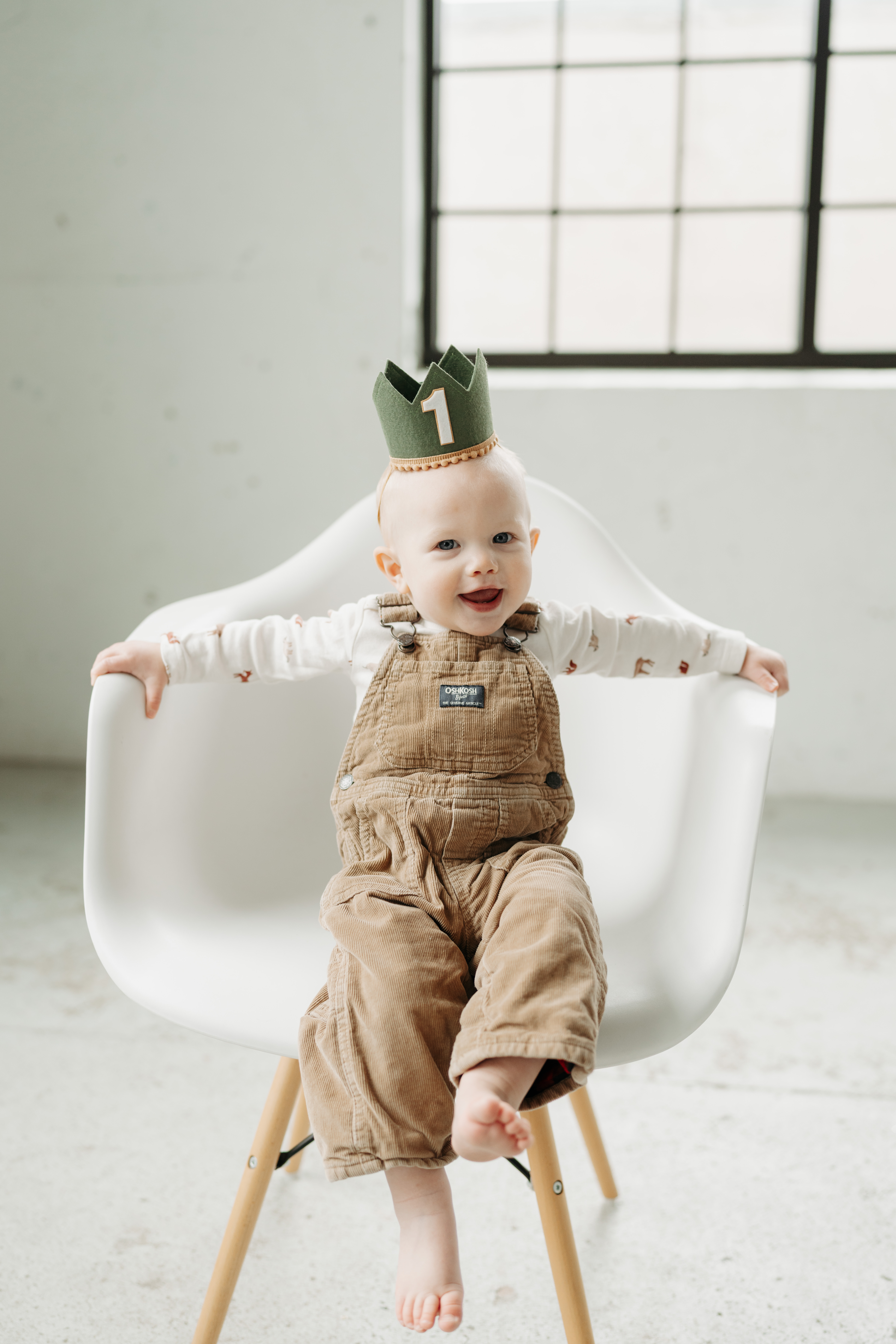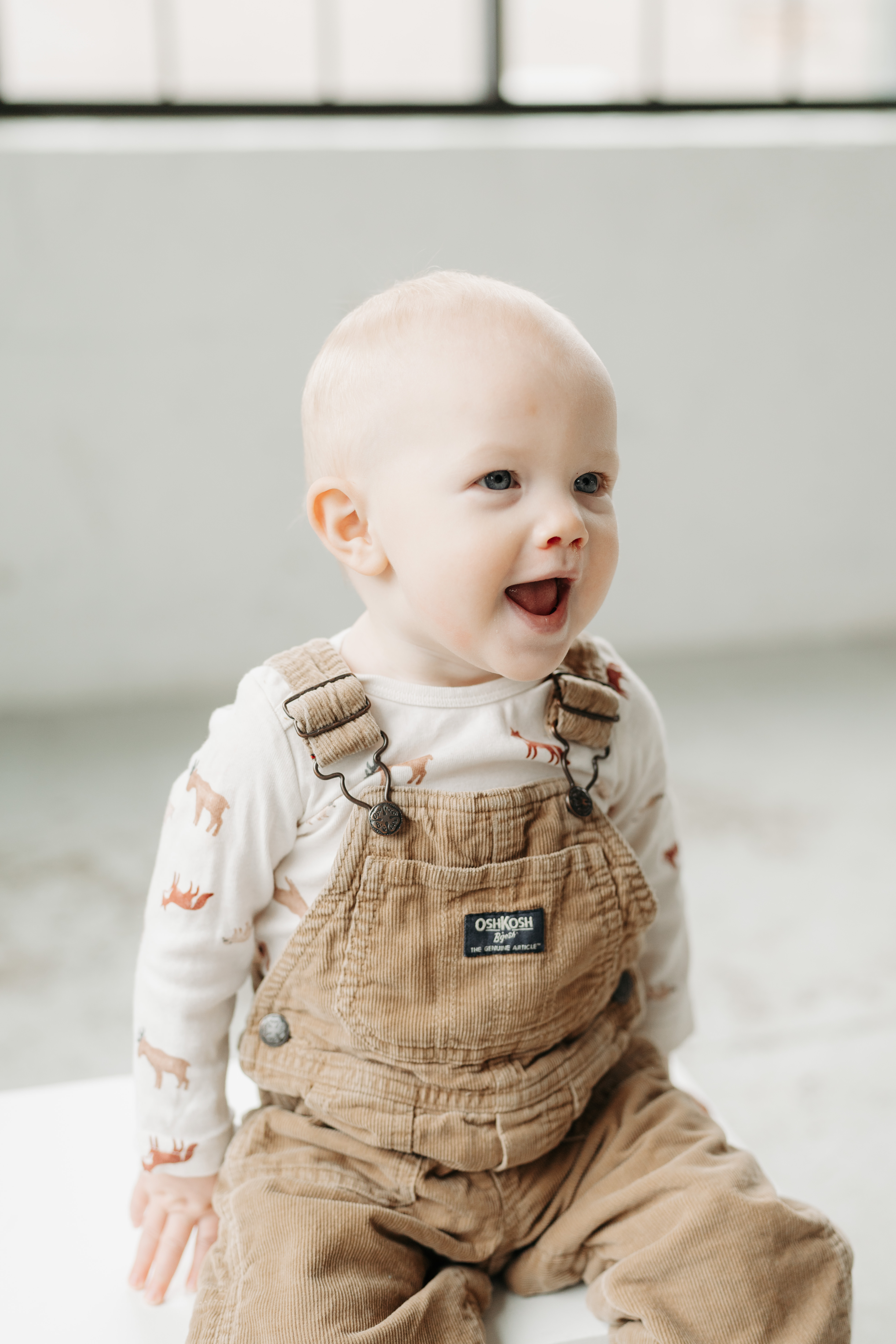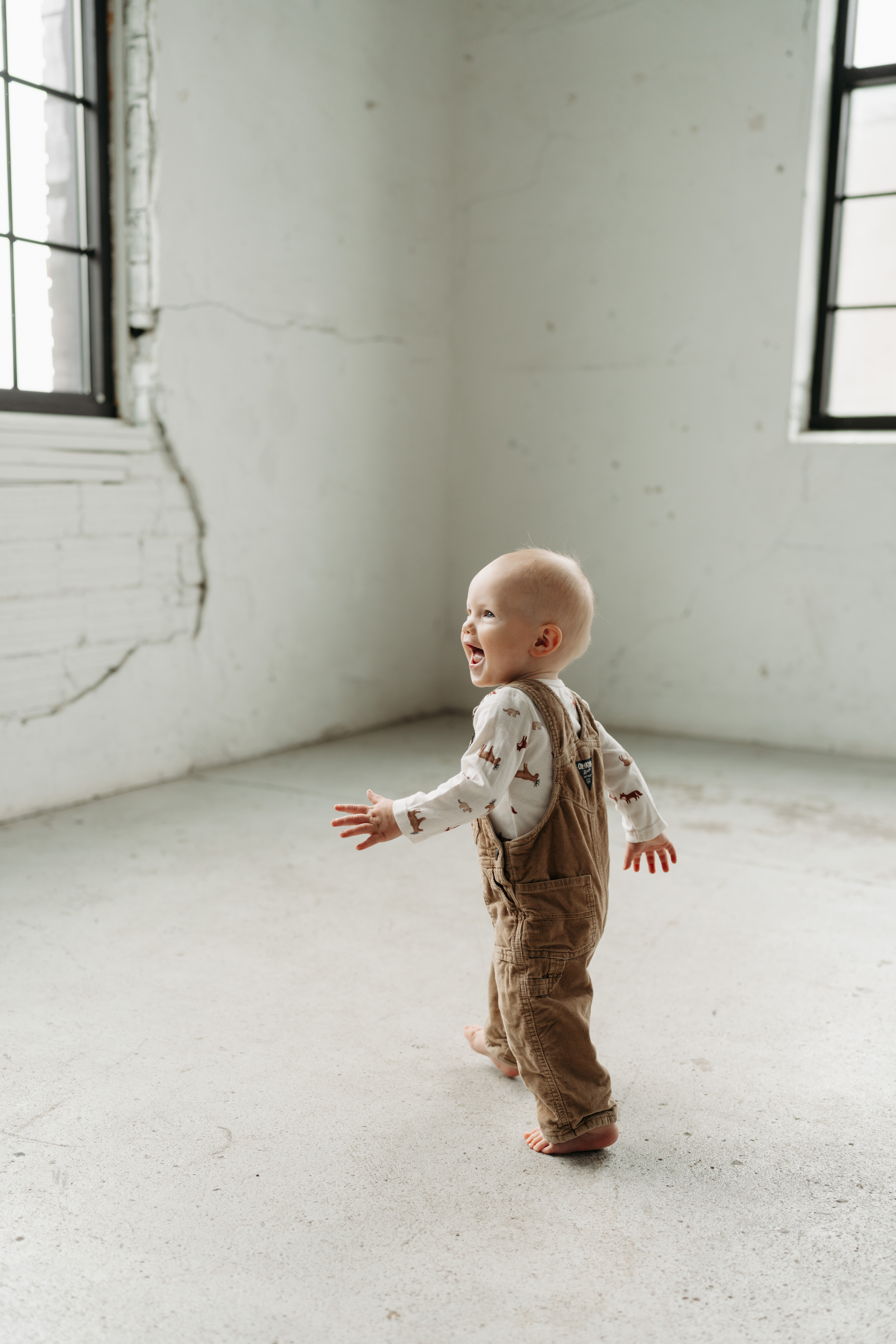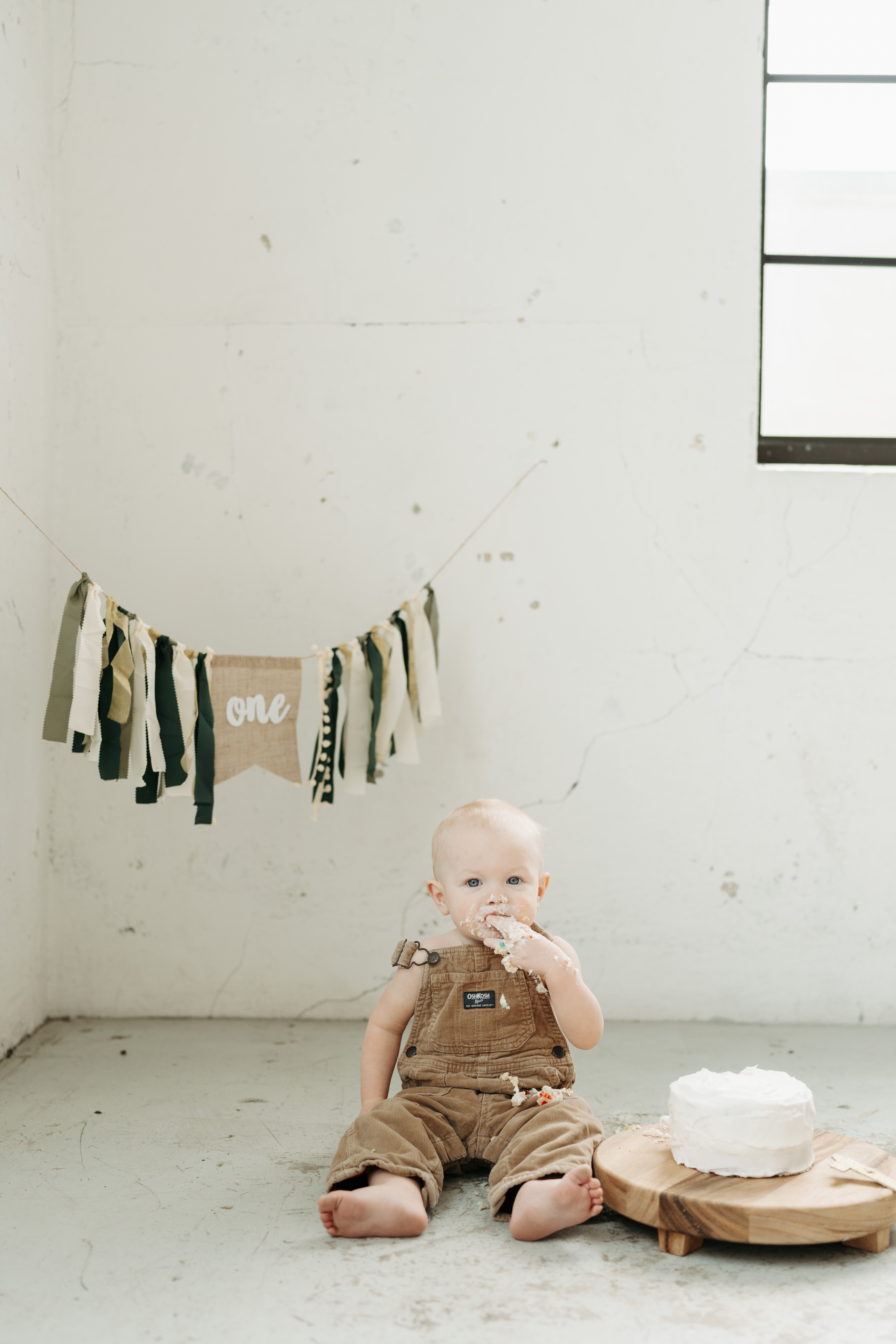 We started this Fargo, ND cake smash session with classic milestone portraits. These are always my favorite way to begin. We chased the birthday boy around the studio and managed to captured those timeless, clean images that I know parents love to frame. The simple and aesthetic backdrop at Ivy & Rose Warehouse made everything feel soft, bright, and modern.