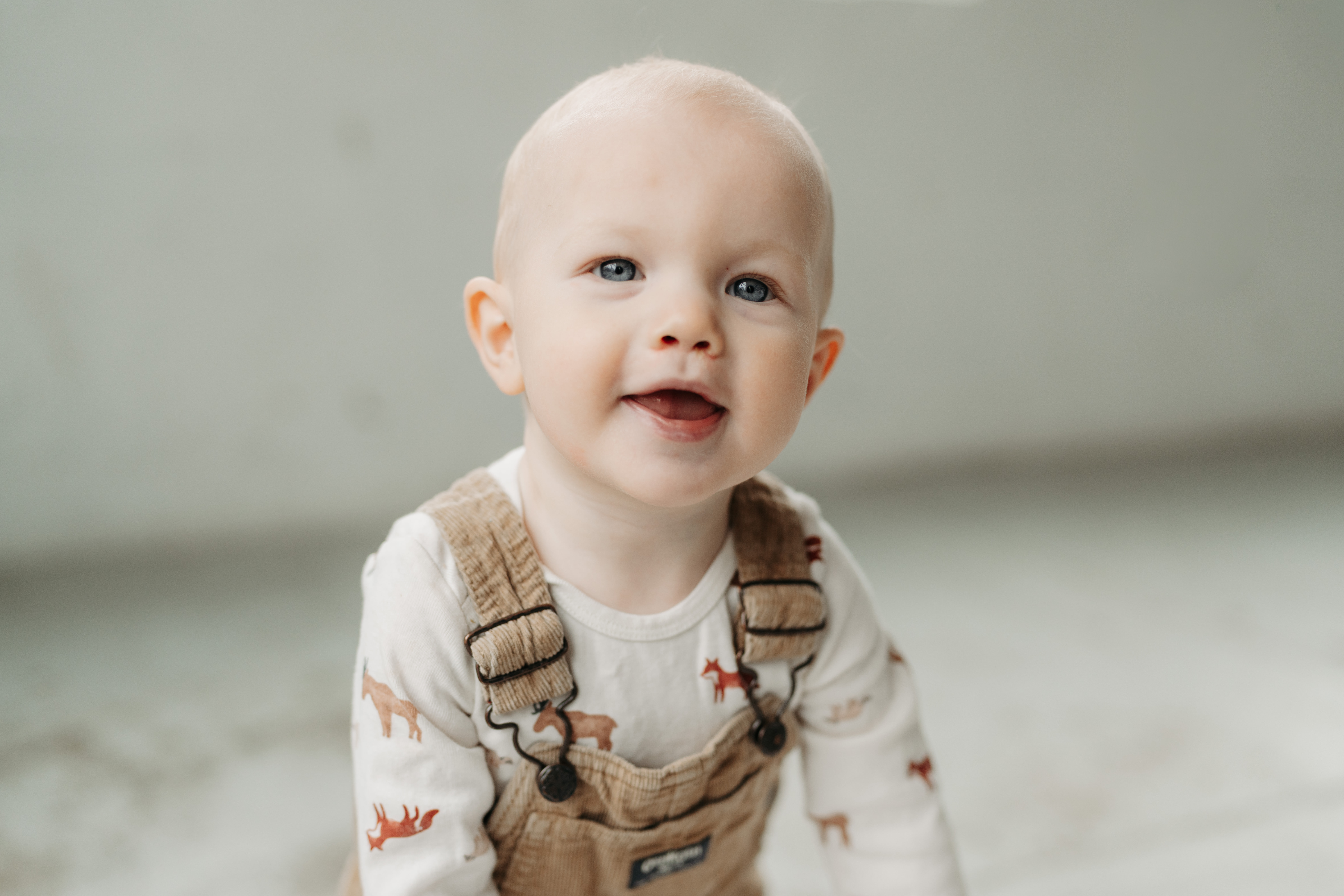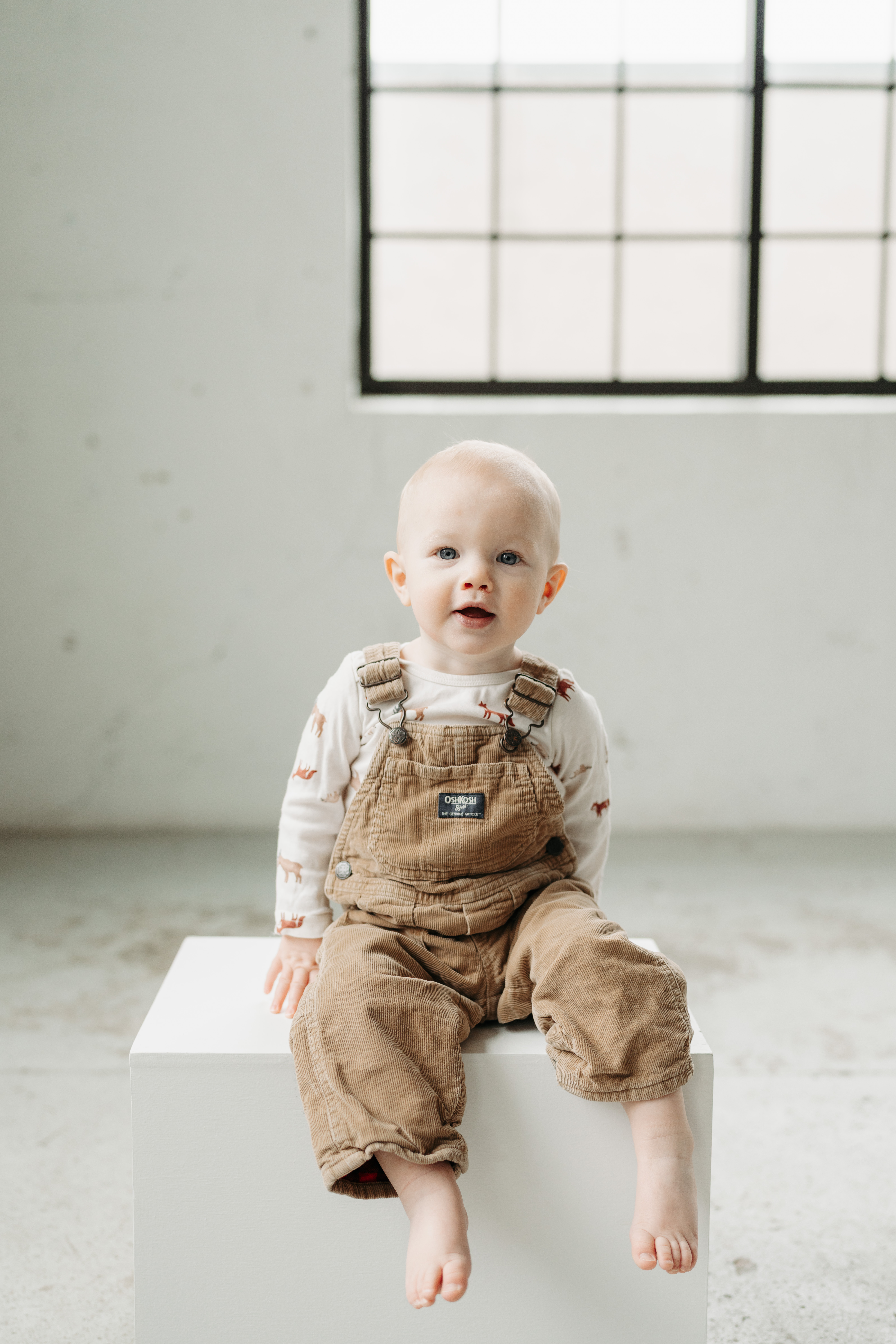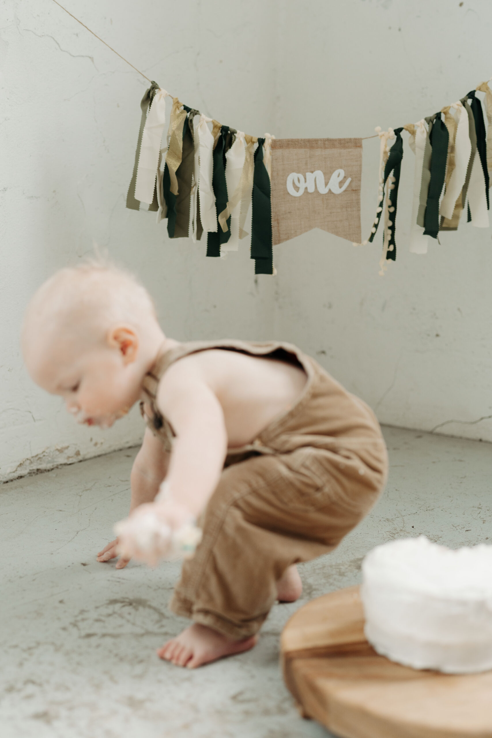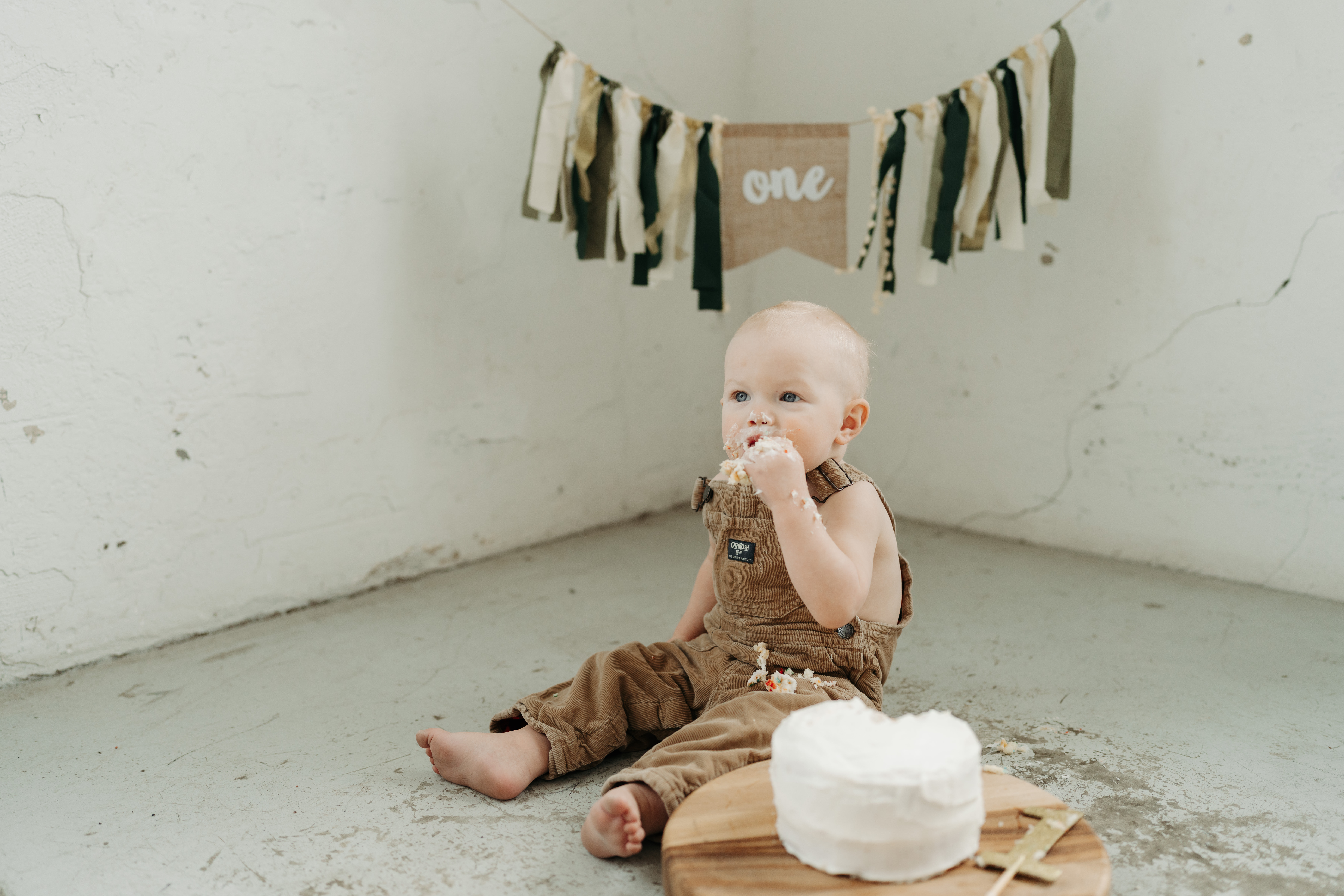 We started this Fargo, ND cake smash session with classic milestone portraits. These are always my favorite way to begin. We chased the birthday boy around the studio and managed to captured those timeless, clean images that I know parents love to frame. The simple and aesthetic backdrop at Ivy & Rose Warehouse made everything feel soft, bright, and modern.