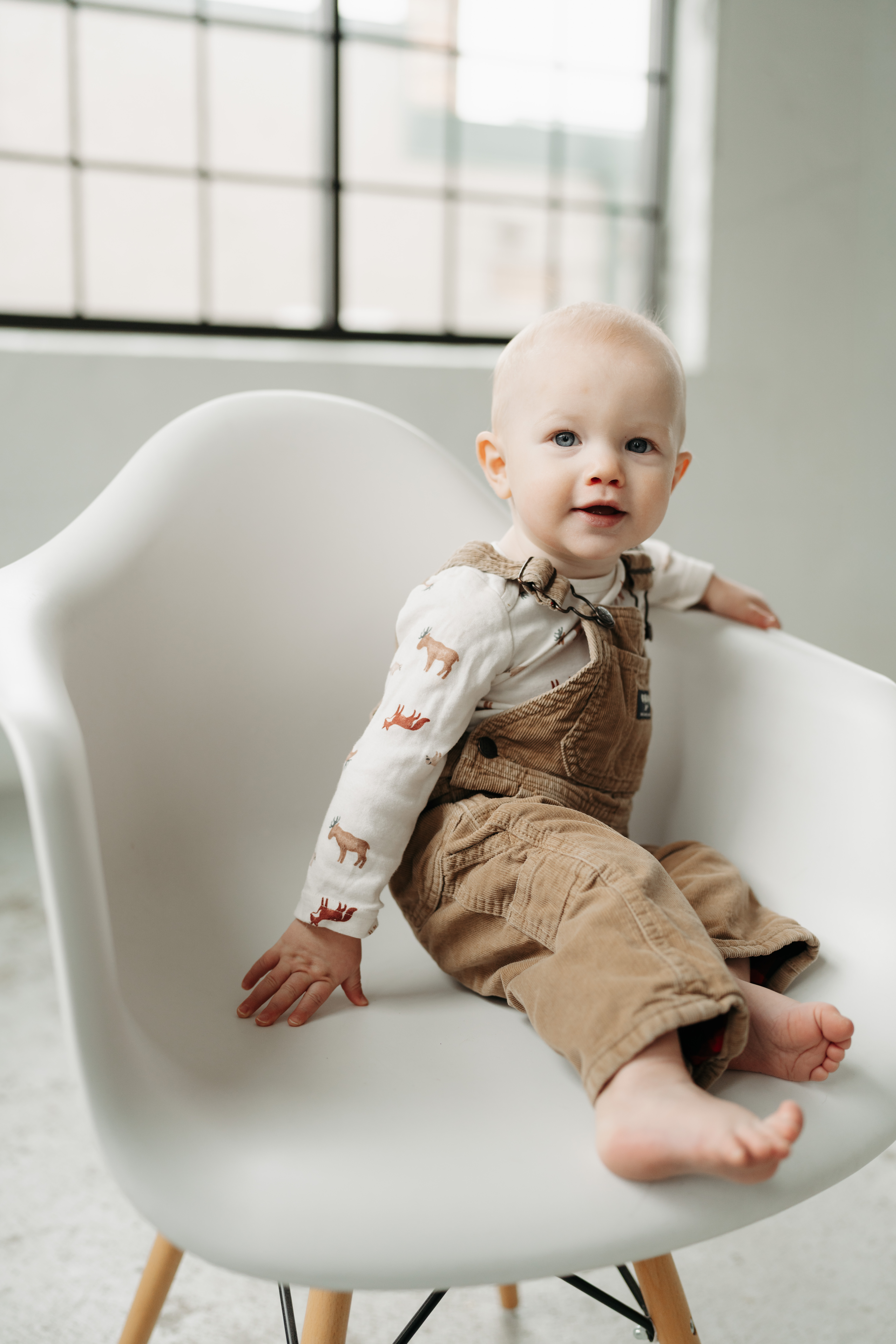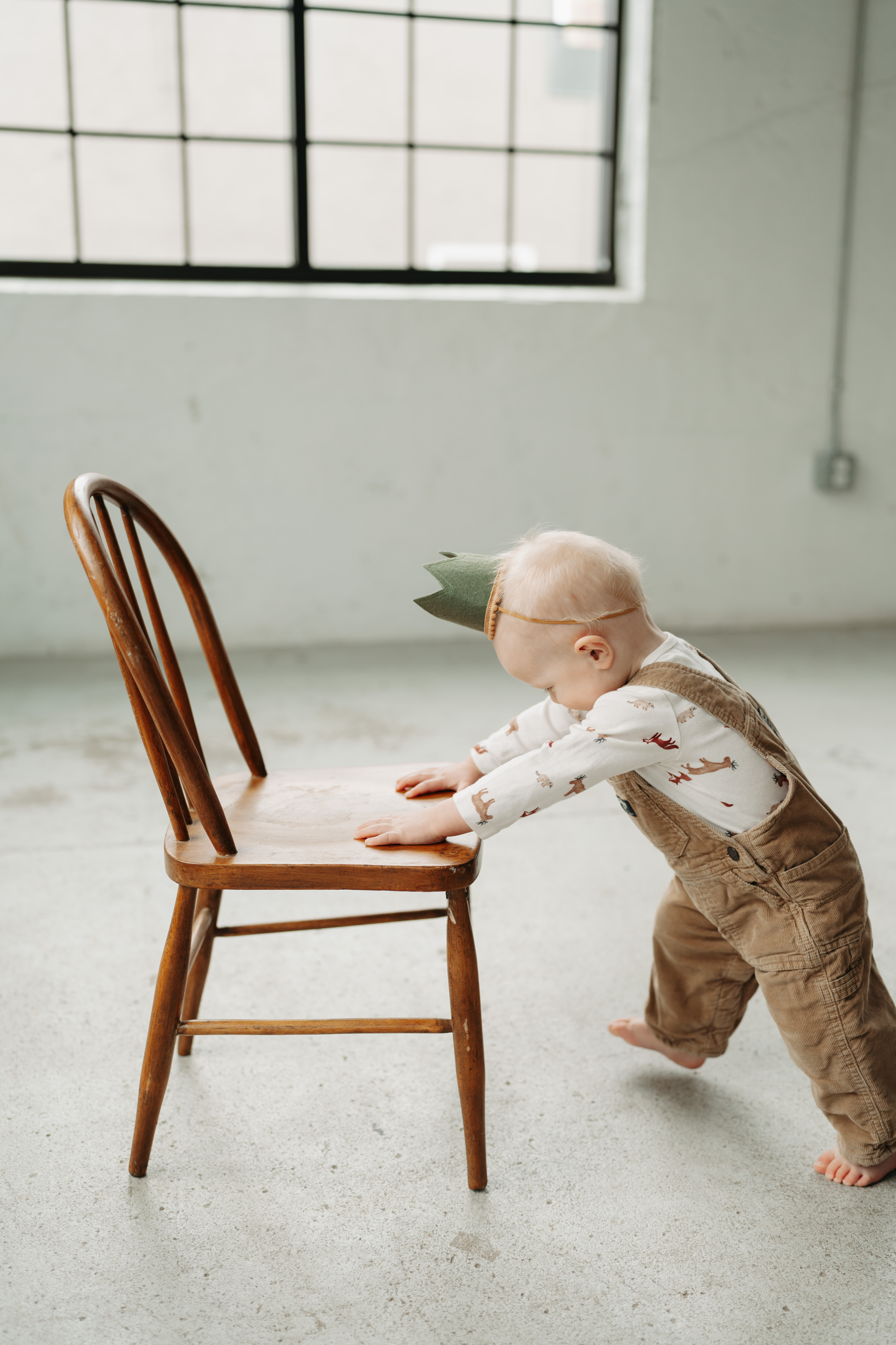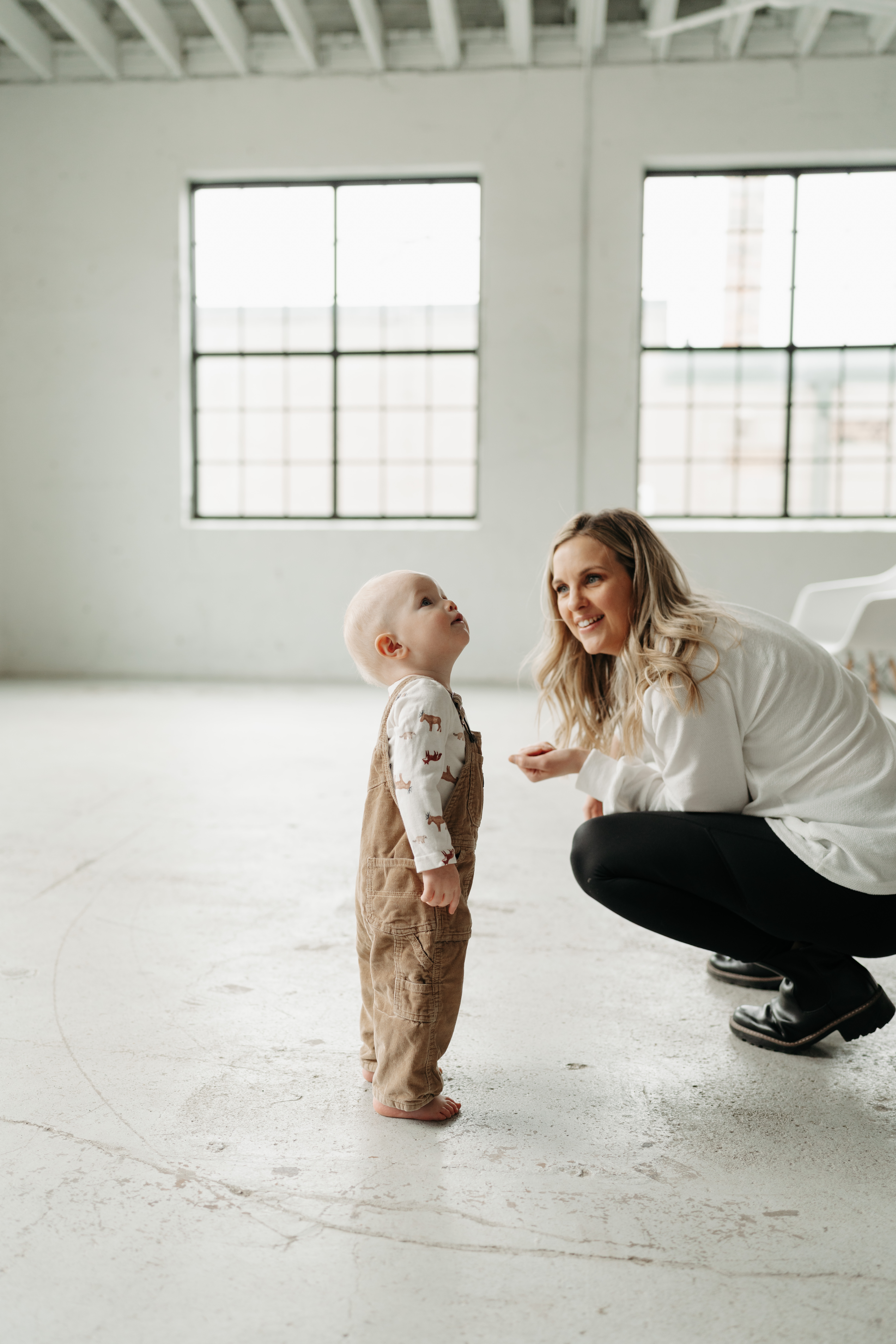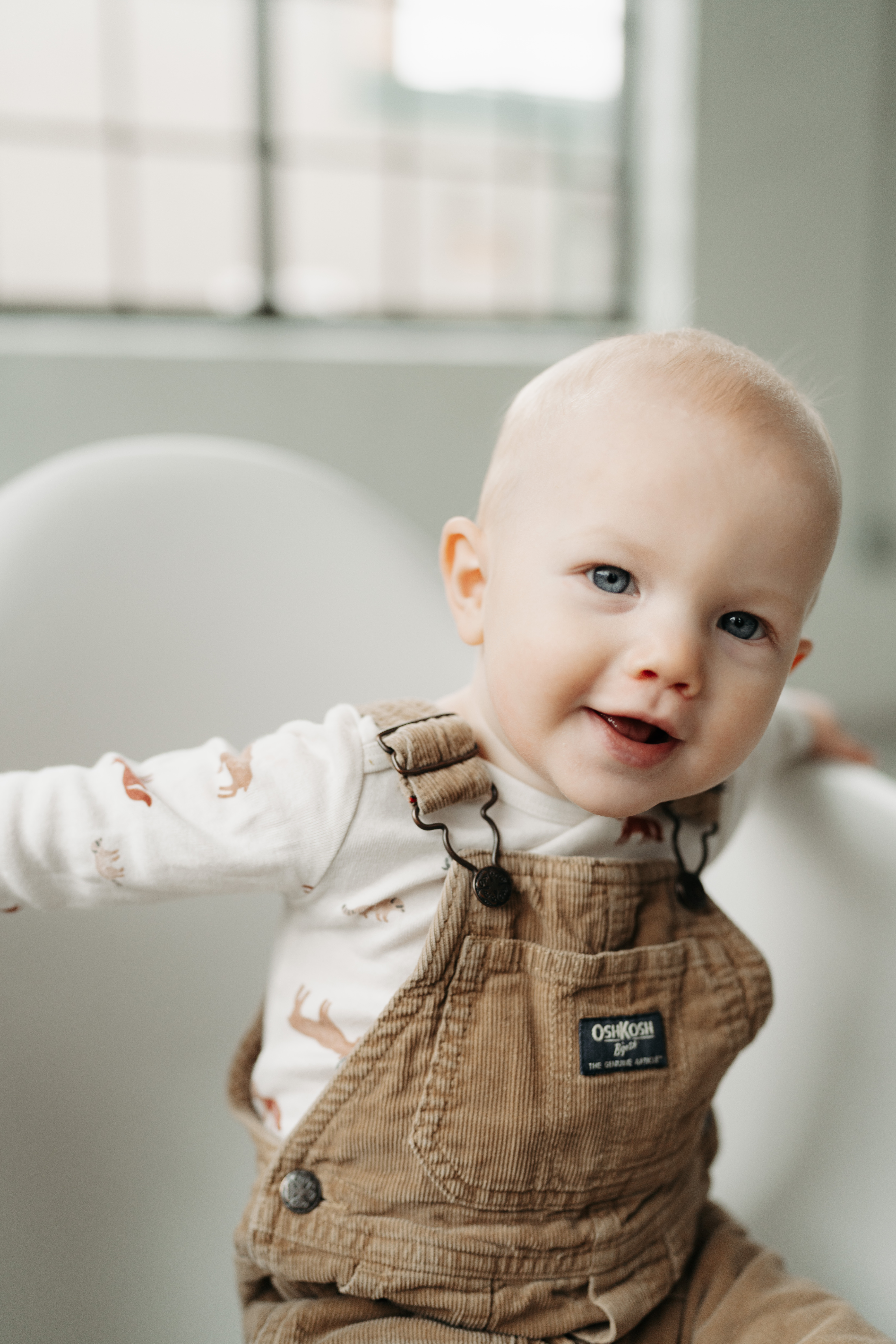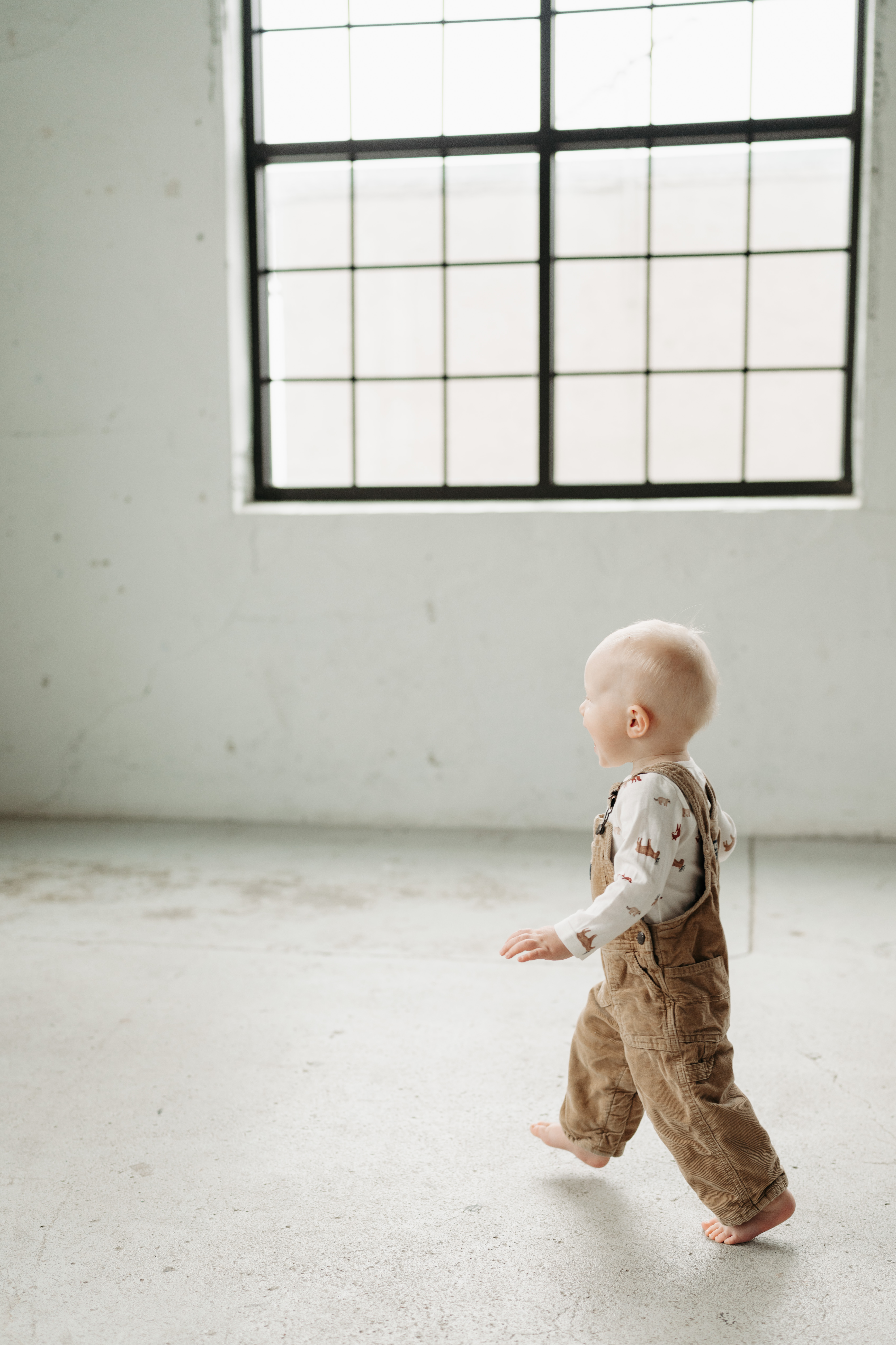We started this Fargo, ND cake smash session with classic milestone portraits. These are always my favorite way to begin. We chased the birthday boy around the studio and managed to captured those timeless, clean images that I know parents love to frame. The simple and aesthetic backdrop at Ivy & Rose Warehouse made everything feel soft, bright, and modern.