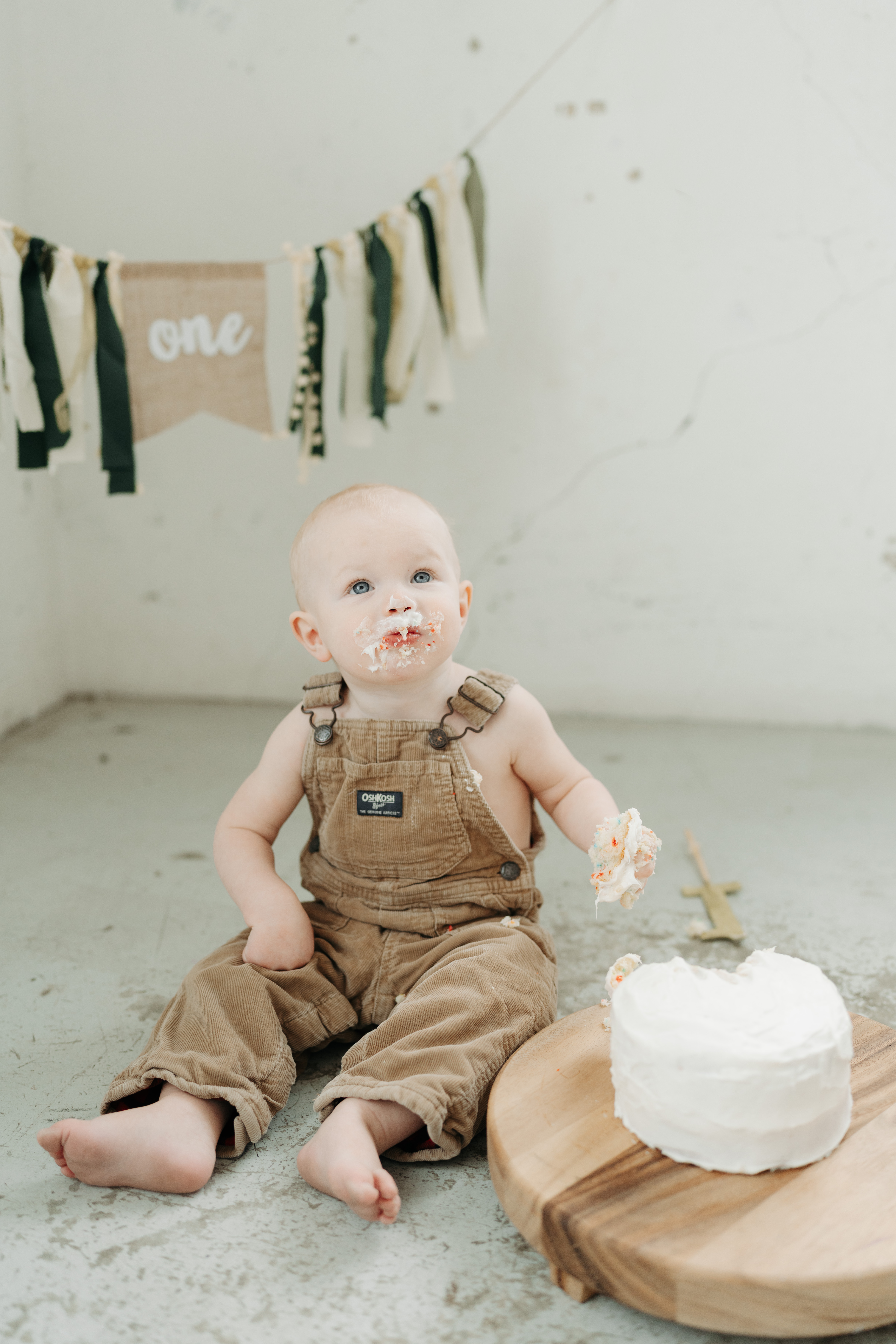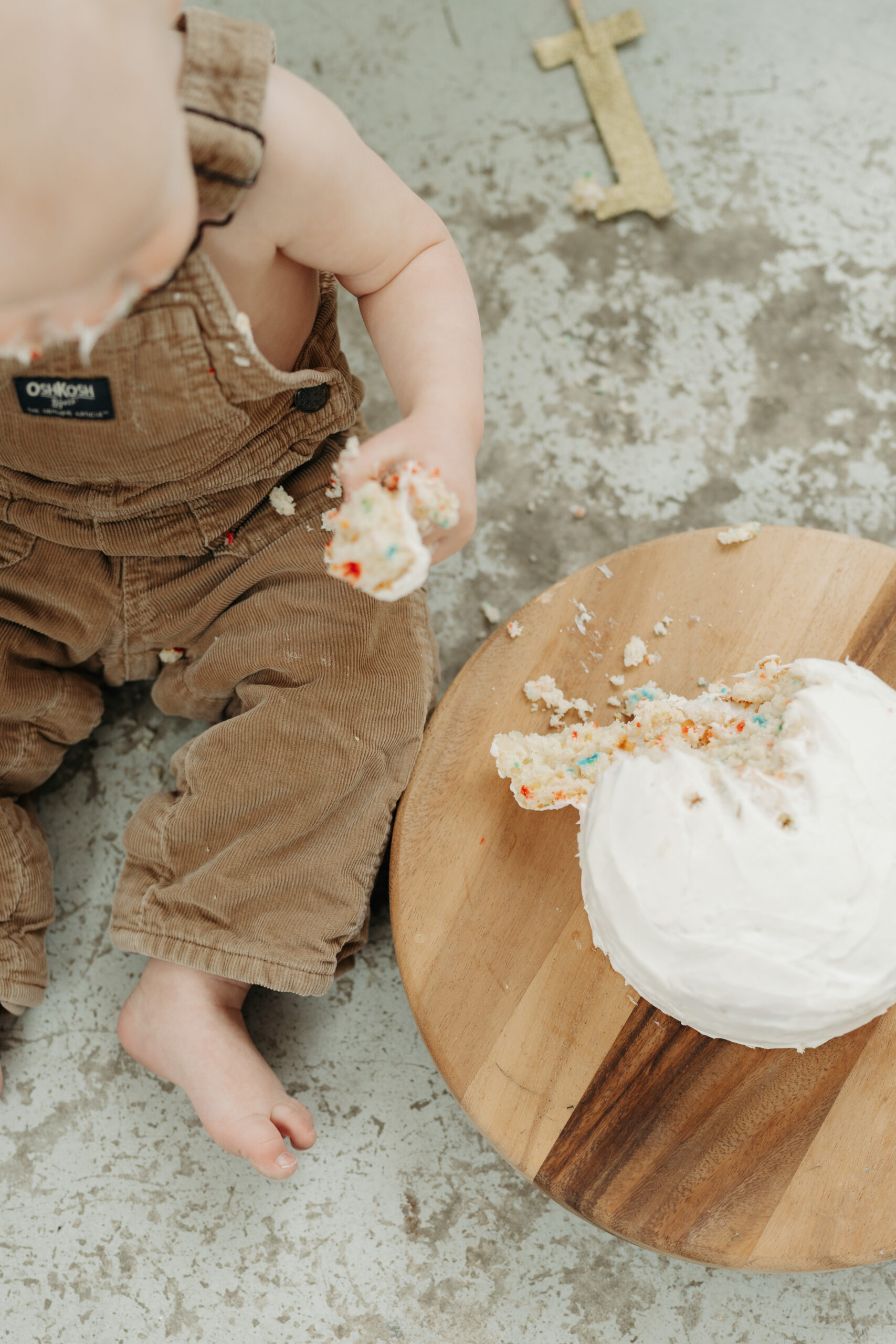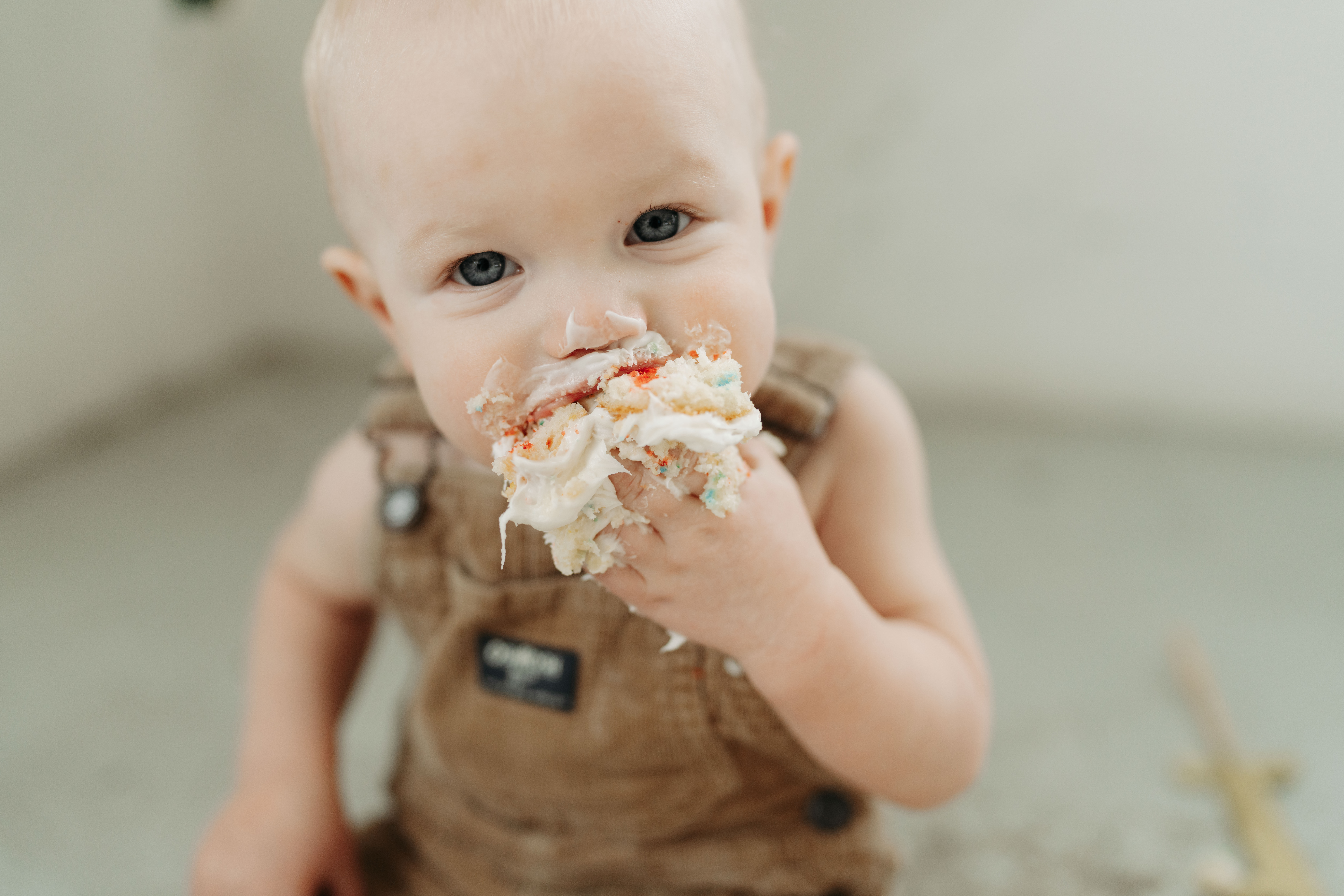 Ending with the cake smash after milestone portraits always works best. It keeps outfits clean for those classic shots. Then we let them go wild at the end.